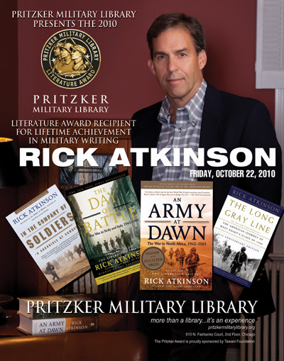 Rick Atkinson received the 2010 Pritzker Military Library Literature Award for Lifetime Achievement in Military Writing. The $100,000 honorarium, citation and medallion, sponsored by the Chicago-based Tawani Foundation, were presented at the Library’s annual Liberty Gala on October 22, 2010.