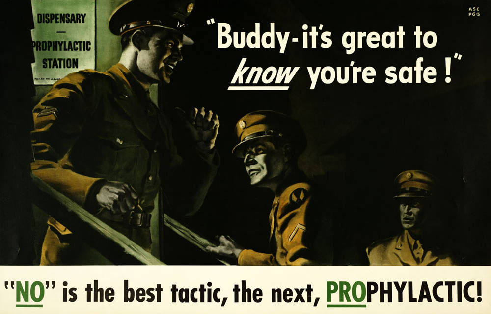 Poster shows a soldier coming out of a dispensary/prophylactic station and talking to two soldiers waiting in line to go in.