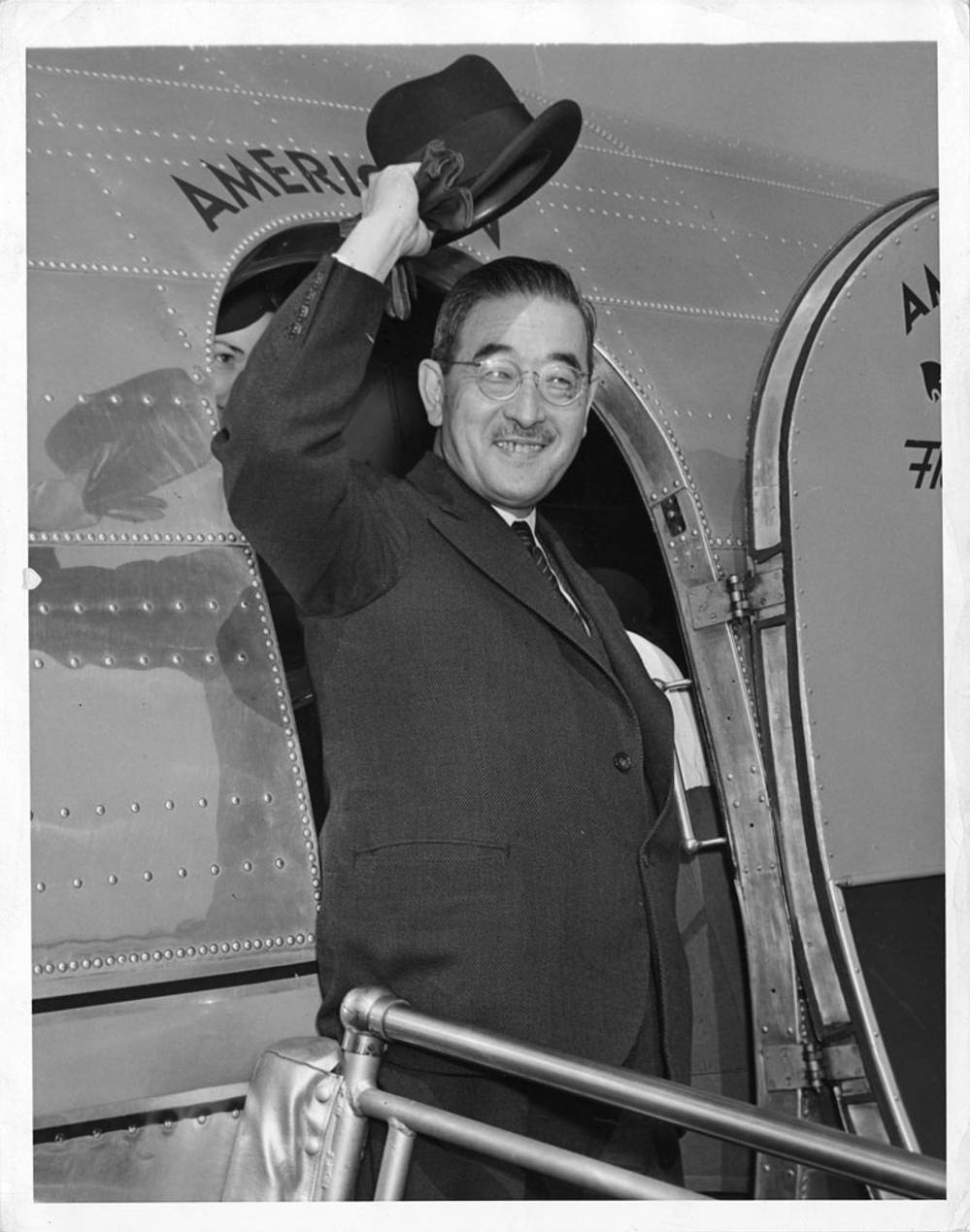 - "NEW YORK -- Waving his hat, Saburo Kurusu, Japan's Special Ambassador, boards plane at LaGuardia Field, where he paused today on his air trip from Tokyo to Washington. He will attend conferences intended to settle Japanese-American difficulties in the Orient and the Pacific."