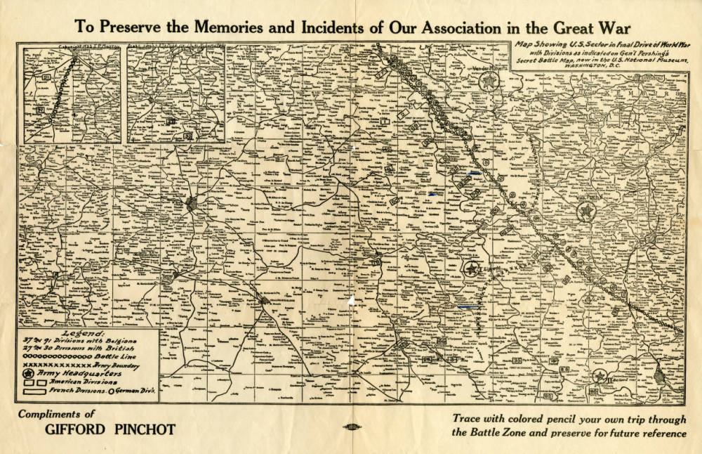 Map showing U.S. Sector in final drive of World War with Divisions as indicated on Gen'l Pershing's secret battle map, now in the U.S. National Museum, Washington, D.C. 1:525888.