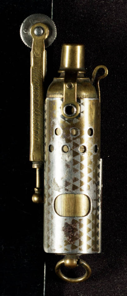 Lighter is made of brass, and includes an arm with a flint wheel and a snuffer cap, the latter of which attaches to a windshield that surrounds the body. On the sides of the arm are the inscriptions, "Patent No 105107", "Imco", and "Made in Austria". The windshield has small and large wholes punched in it, and once had a pattern of alternating brass- and silver-colored chevrons which has since faded or been rubbed away in places. A ring is attached to a section of the bottom of the lighter, which can be unscrewed. Underneath the snuffer cap is presumably a wick, but both the cap and windshield are stuck in place.