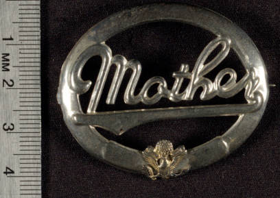 Sterling silver brooch is oval shaped and has the word "Mother" in the middle. At the bottom is the US seal. The word "STERLING" is stamped into the metal on the reverse side of the badge.
