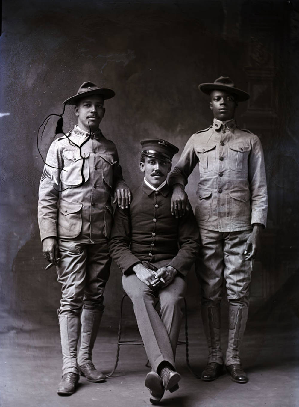 A trio of African American soldiers, one is from the 9th Cavalry.