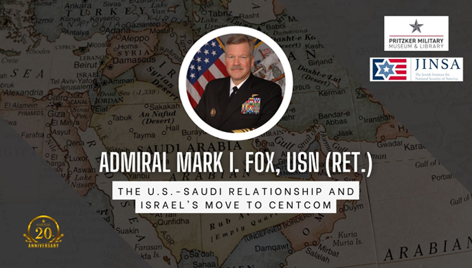 Join the Pritzker Military Museum and Library (PMML) and The Jewish Institute for National Security of America (JINSA) for a program featuring Vice Admiral Mark I. Fox, USN (ret.) discussing the benefits of Israel joining CENTCOM and his perspective on the U.S.-Saudi relationship from his participation in the JINSA fact finding trip to Kingdom of Saudi Arabia.